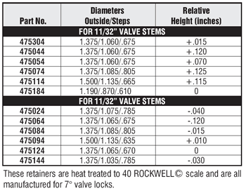 NOTE: There are many tolerances that effect the final location and spring height. The relative height dimension is for comparison purposes of these retainers. We took a stock SB Chevy retainer with our 45103 valve and 47601 locks and measured from the rocker arm end of the valve to the spring seat on the retainer. We then took the same dimensions for our 11/32” stem retainers. The 47518 is the same as the stock retainer and is shown as zero. The relative height tells how much the assembled spring height will be changed if you changed from the 47518. The 47501 would shorten the height by .070” while the 47505 would increase it the same amount. The same applies to the 3/8” stem retainers except we used a stock BB Chevy retainer with our 45105 valve and 47300 locks as a starting point.